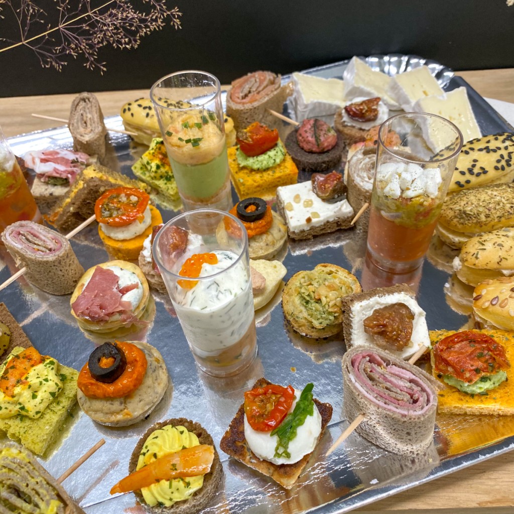 L'assortiment pour une personne comprend :, 5 toasts froids, 5 minis bouchées, 3 verrines, 3 galettes fourrées, Éventail de camembert & emmental, 3 réductions sucrées
