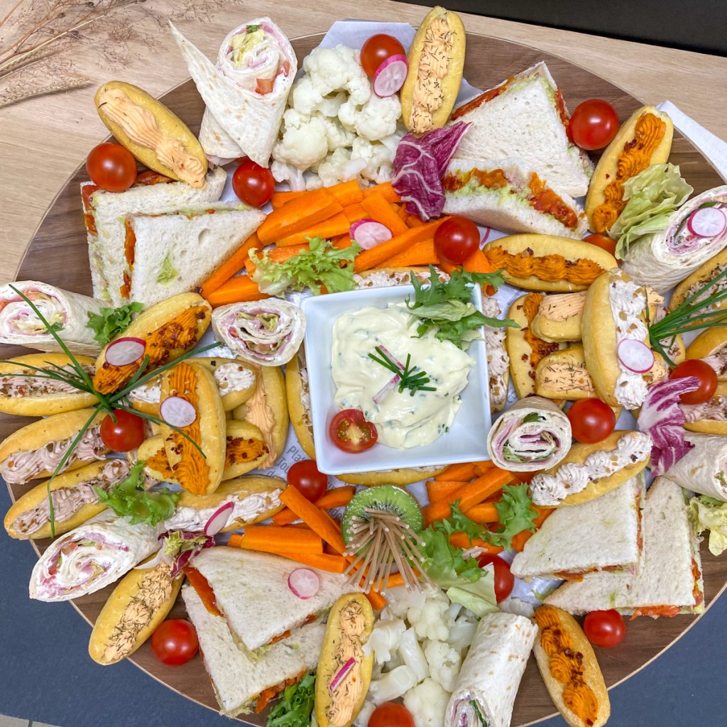 45 pièces, + 400g de légumes, + 150g de sauce ˜ 10 personnes, Clubs pain de mie thon, tomate et guacamole, Wraps fromage frais et jambon blanc, Assortiment de navettes :, - fromage frais et menthe poivrée, - thon et poivron rouge, - saumon, - poulet sauce césar., Choux fleur - Bâtonnets de carottes - Tomates cerises - Sauce crème de ciboulette
